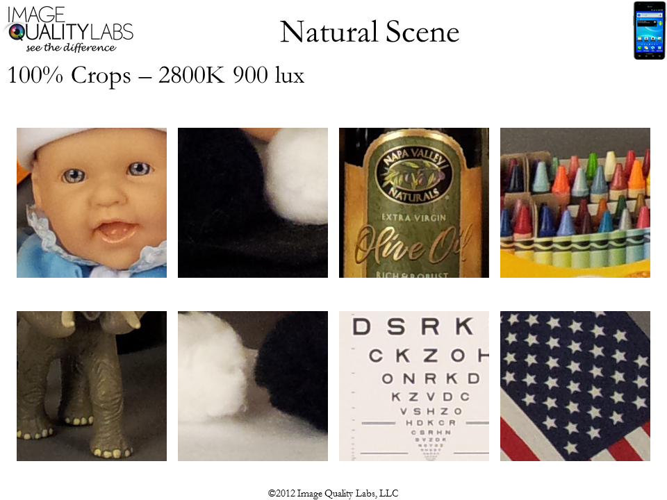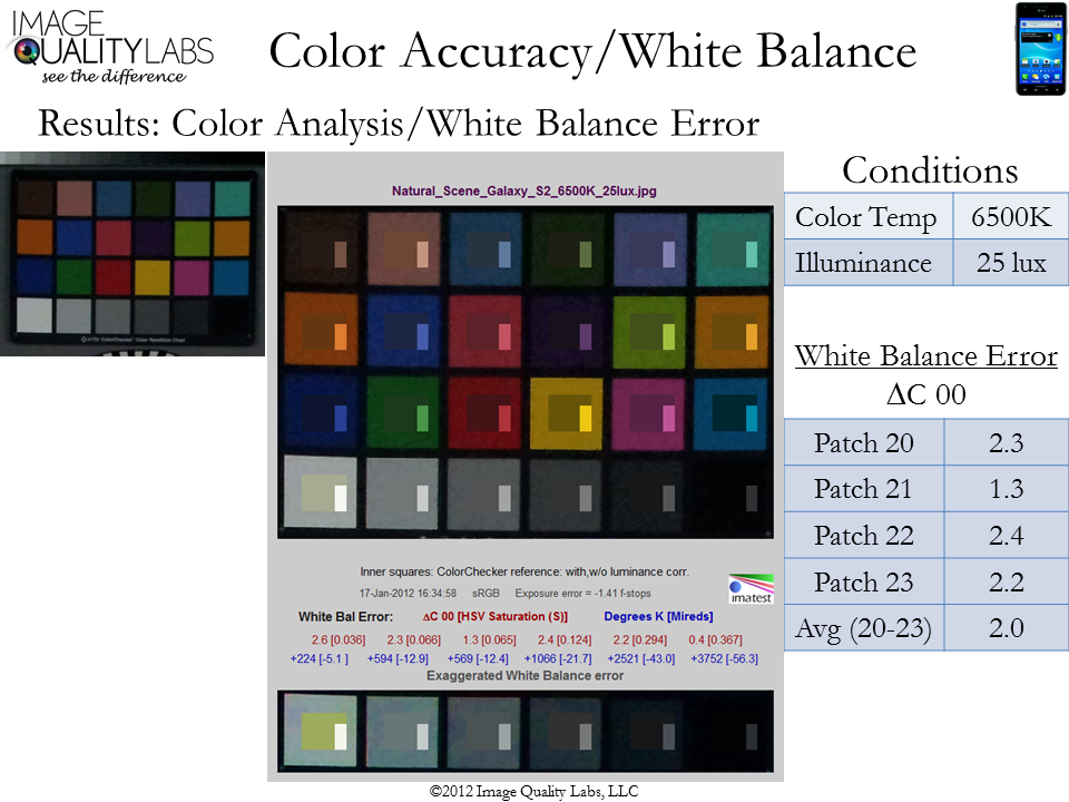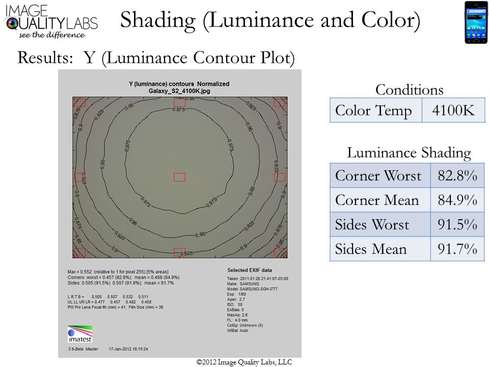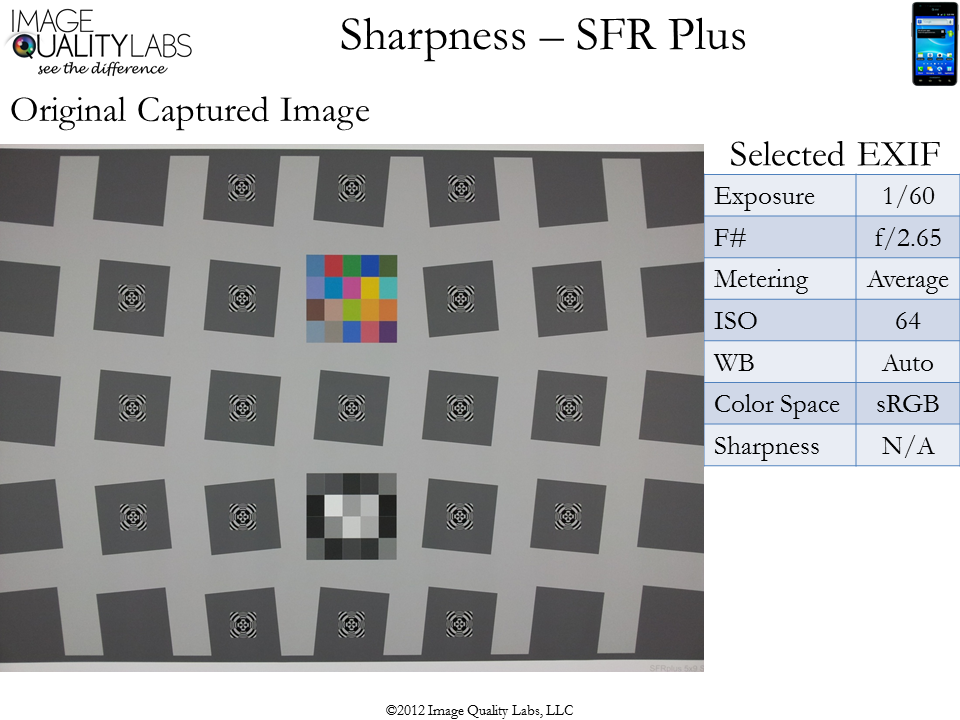 测试的图像质量参数包括:: 锐度, SMIA TV 畸变,视场角, 横向色差, 非线性信号响应, 渐晕 (亮度和色彩), 闪光灯均匀性, 动态范围, 信噪比 (SNR), 色彩还原/白平衡,以及实景主观和客观评价。