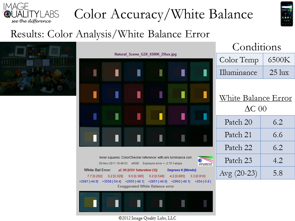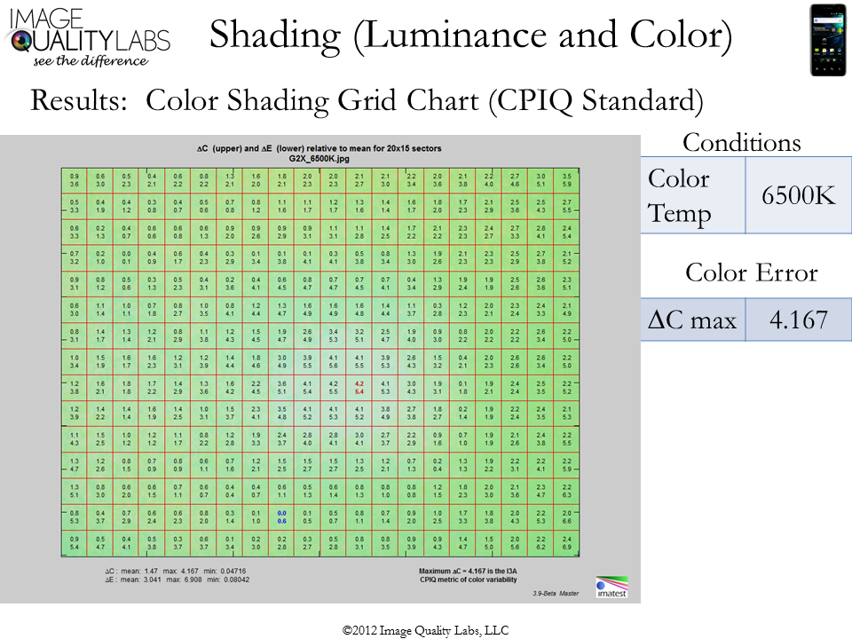 测试的图像质量参数包括:: 锐度, SMIA TV 畸变,视场角, 横向色差, 非线性信号响应, 渐晕 (亮度和色彩), 闪光灯均匀性, 动态范围, 信噪比 (SNR), 色彩还原/白平衡,以及实景主观和客观评价。