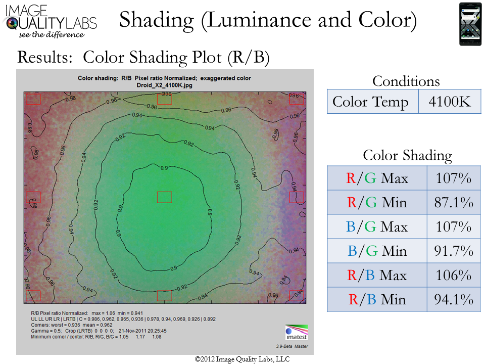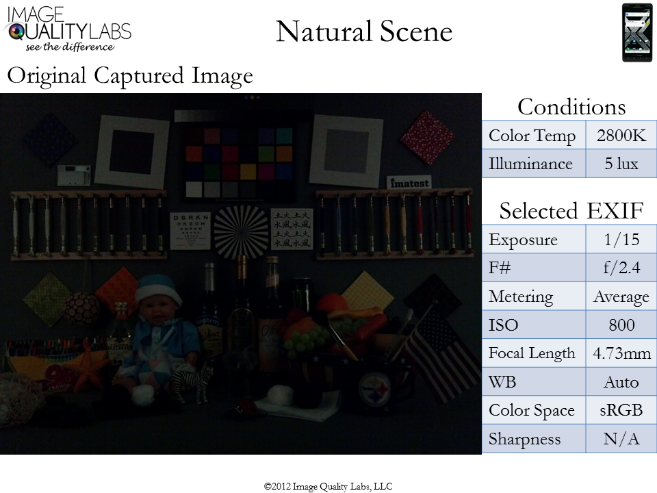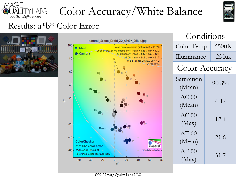 测试的图像质量参数包括:: 锐度, SMIA TV 畸变,视场角, 横向色差, 非线性信号响应, 渐晕 (亮度和色彩), 闪光灯均匀性, 动态范围, 信噪比 (SNR), 色彩还原/白平衡,以及实景主观和客观评价。