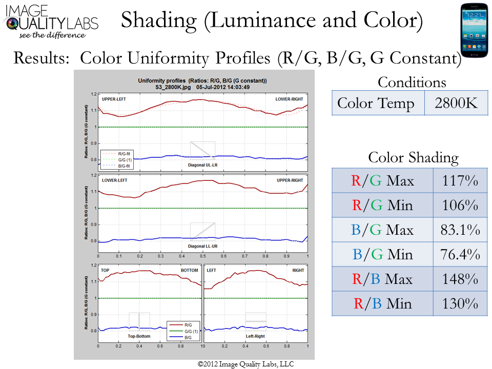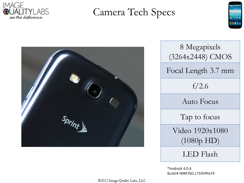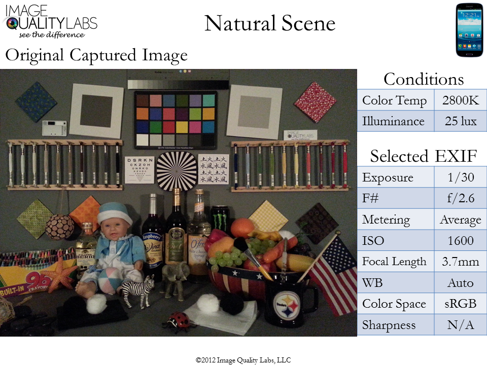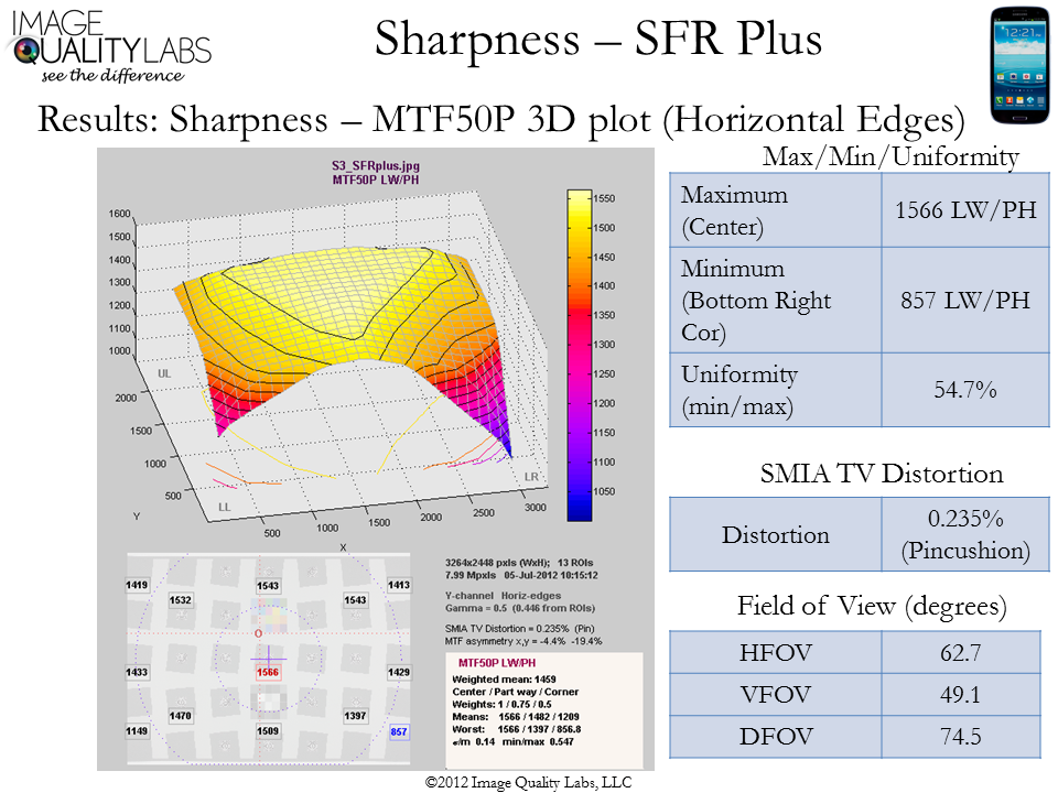 测试的图像质量参数包括:: 锐度, SMIA TV 畸变,视场角, 横向色差, 非线性信号响应, 渐晕 (亮度和色彩), 闪光灯均匀性, 动态范围, 信噪比 (SNR), 色彩还原/白平衡,以及实景主观和客观评价。