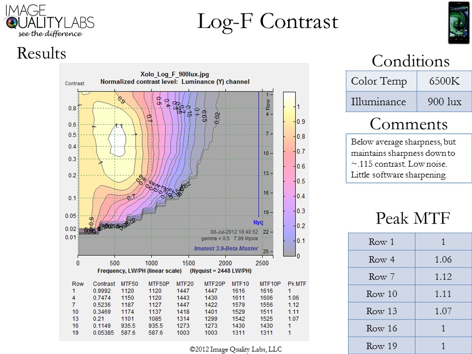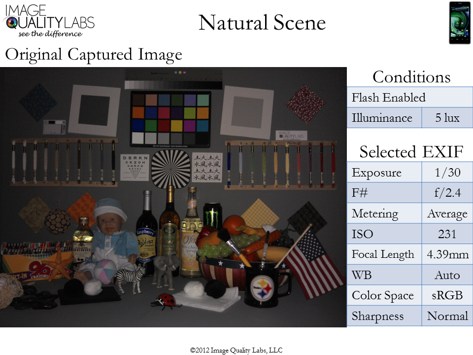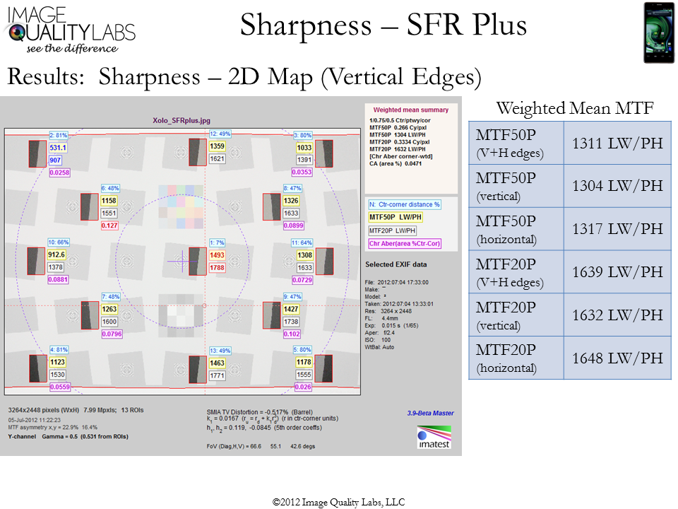 测试的图像质量参数包括:: 锐度, SMIA TV 畸变,视场角, 横向色差, 非线性信号响应, 渐晕 (亮度和色彩), 闪光灯均匀性, 动态范围, 信噪比 (SNR), 色彩还原/白平衡,以及实景主观和客观评价。