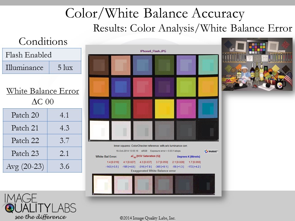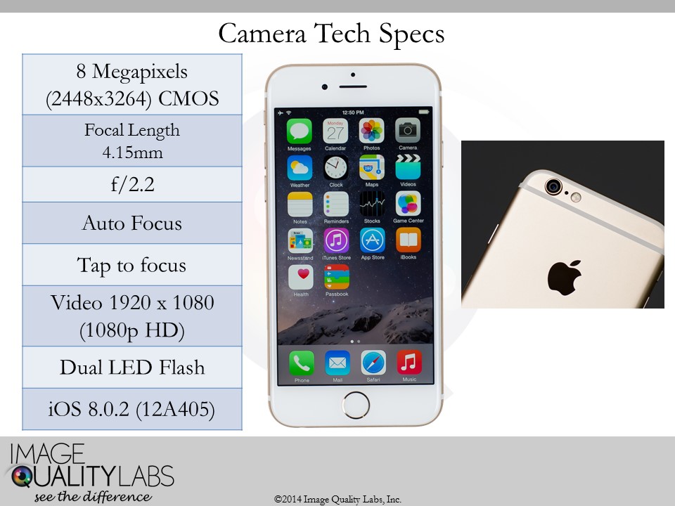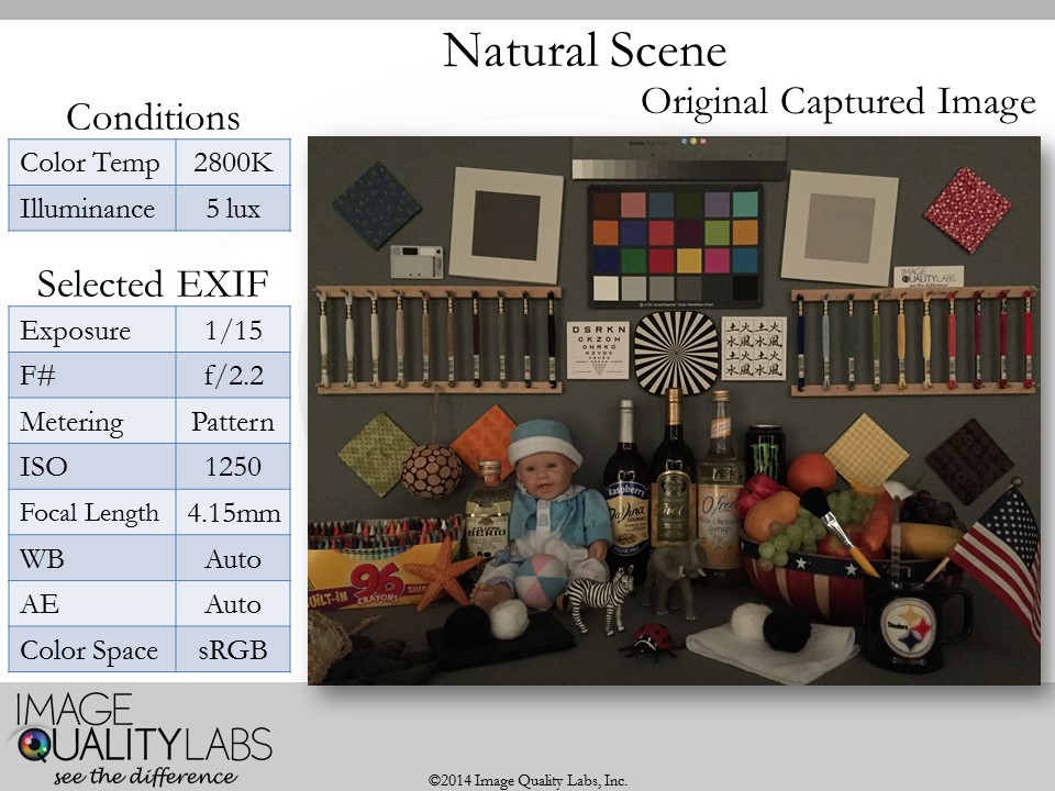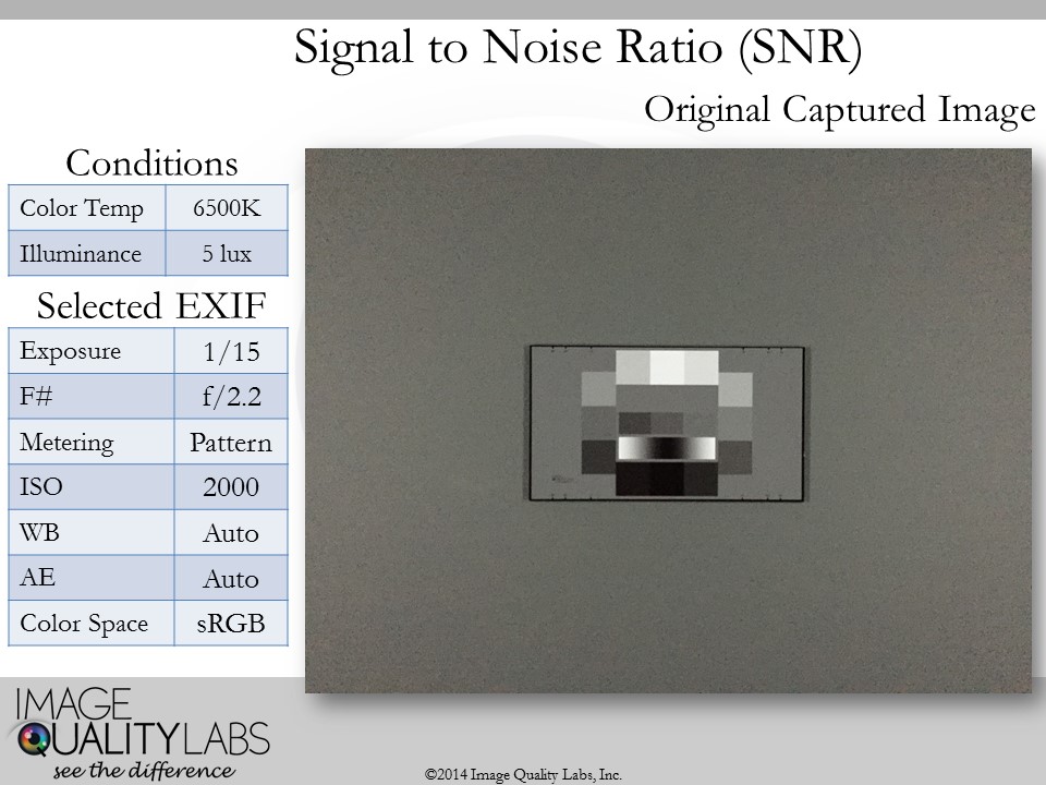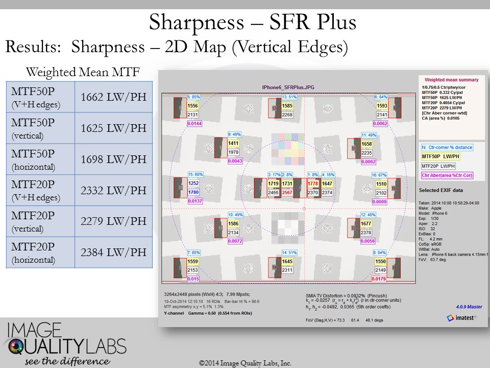 测试的图像质量参数包括:: 锐度, SMIA TV 畸变,视场角, 横向色差, 非线性信号响应, 渐晕 (亮度和色彩), 闪光灯均匀性, 动态范围, 信噪比 (SNR), 色彩还原/白平衡,以及实景主观和客观评价。